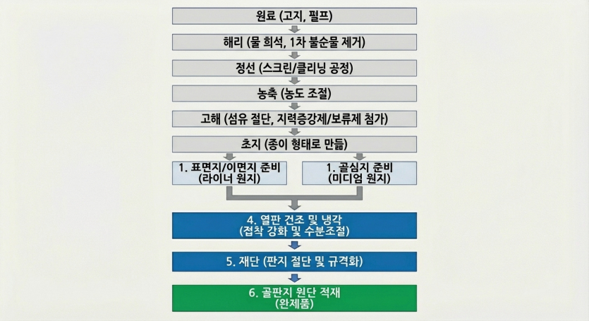 5. 그다음은 초지공정에서 종이형태로 만들어지게되고, 필요한 종이조합의 원지를 골라 표면지 골심지 이면지에 각각 적용됩니다.